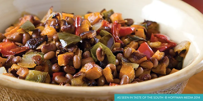Add black-eyed peas to baking sheet, stirring gently to combine. Bake for 5 minutes. Serve hot. Credits: Chantel Lambeth